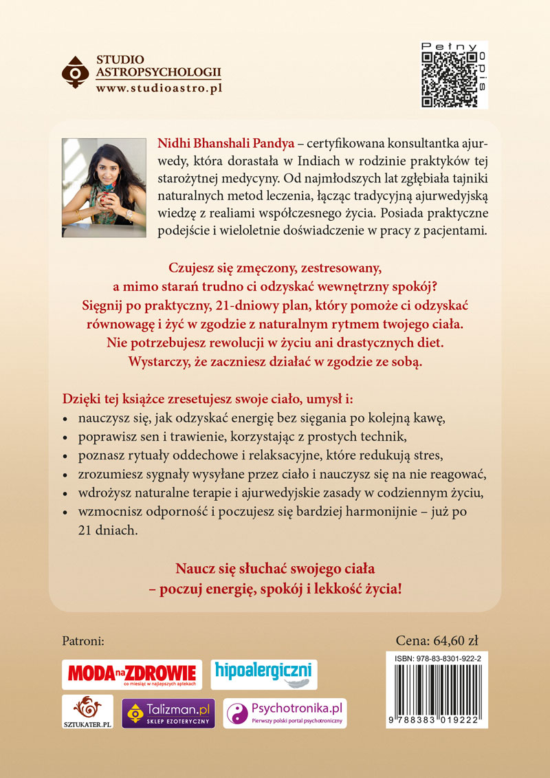 Autorka wywodzi się z rodziny ajurwedyjskich praktyków. Łączy wielopokoleniową tradycję z nowoczesnym podejściem do zdrowia. Dzięki temu książka nie tylko opisuje, czym jest ajurweda, ale też wskazuje, jak w praktyce stosować terapie naturalne, ćwiczenia oddechowe i medytację w codziennym życiu. Z pomocą tego poradnika z pewnością nauczysz się lepiej spać, łagodzić napięcia i stres, usprawnić trawienie, poprawić odporność oraz wsłuchiwać się w sygnały własnego ciała. Odkryjesz, jak wygląda codzienne oczyszczanie organizmu według ajurwedy. Bez głodówek, bez wyrzeczeń, za to z uważnością i troską.