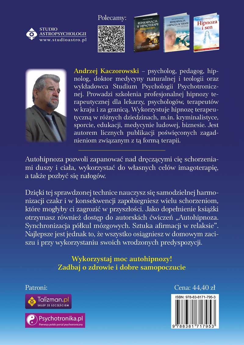 Dzięki publikacji Andrzeja Kaczorowskiego, autora licznych książek poświęconych hipnozie, każdy z nas będzie w stanie wprowadzać się w te stany w pełni świadomie i robić to w konkretnym celu. Ten wybitny psycholog, pedagog, hipnolog, doktor medycyny naturalnej i teologii oraz wykładowca Studium Psychologii Psychotronicznej przedstawia szereg ćwiczeń, dzięki którym autohipnoza stanie się praktycznym i często wykorzystywanym narzędziem. Od tej chwili zmienisz swój pogląd na leczenie hipnozą oraz autohipnozą – przekonasz się o ich korzyściach, jakich nie zyskałeś nigdy wcześniej.