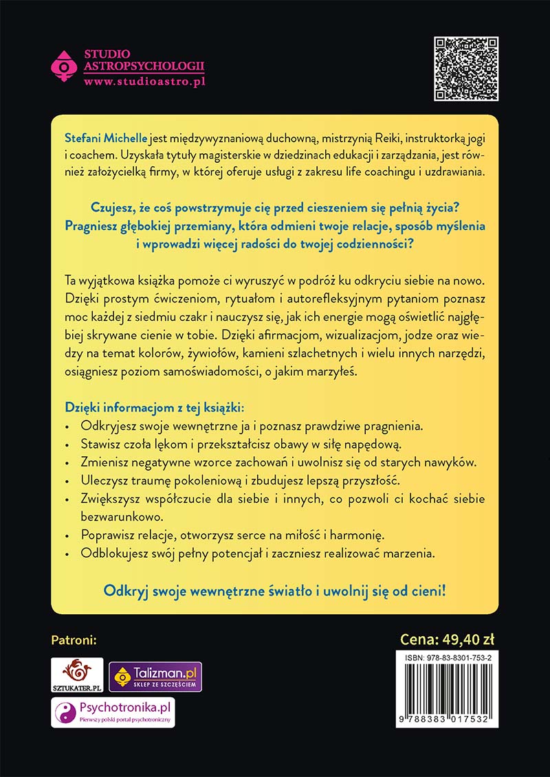 Książka Jak przekształcić cień w siłę dzięki unikalnej energii każdej z czakr jest czymś więcej niż tylko przewodnikiem po czakrach. To kompletny system pracy z cieniem – częścią ciebie, którą zwykle wypierasz, ale która kryje w sobie ogromny potencjał. Autorka podzieliła treść na przystępne sekcje. Prowadzą one czytelnika od podstawowych koncepcji aż do zaawansowanych technik i terapii, które można zastosować na co dzień. Czy wiesz, że zablokowane czakry mogą prowadzić do problemów zdrowotnych, emocjonalnych i duchowych? Dzięki tej lekturze dowiesz się, jak oczyścić te blokady, umożliwiając swobodny przepływ energii, co doprowadzi do pełniejszego, bardziej zrównoważonego życia.