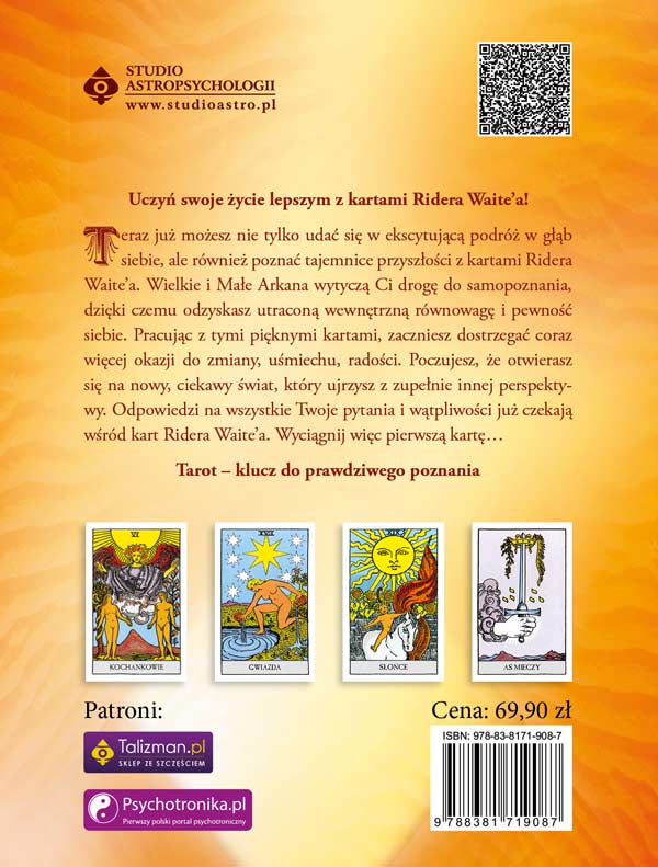 Niegdyś Tarot uważano za sztukę tajemną, dostępną jedynie dla wybranych. Aktualnie coraz więcej osób pragnie poznać jego tajniki. Powstają więc podręczniki astropsychologii przybliżające wróżenie z kart Tarota. Wśród najpopularniejszych talii są karty Ridera Waite’a oraz Tarot Marsylski. Przed Tobą najbardziej klasyczna ze wszystkich talii służących do wróżenia z kart Tarota – talia Ridera Waite’a. To właśnie ją– ze względu na prostotę i czytelne symbole – najczęściej poleca się początkującym adeptom wróżbiarstwa. Klasyczna grafika kart pomaga rozpoznać symbole Tarota, a zawarte na każdej karcie znaczenie eliminuje konieczność każdorazowego sięgania do podręcznika. Dzięki tej książce, która stanowi cenne wprowadzenie do sztuki wróżenia z kart Tarota, i niezwykłym kartom Ridera Waite’a, odkryjesz sekretne znaczenia kart Tarota zawarte w Wielkich Arkanach i Małych Arkanach. Nauczysz się interpretować skrywające się w nich symbole i poznasz przykładowe rozkłady kart Tarota, które będę dla Ciebie świetnym treningiem. Od tej pory Twoje wróżby będą celną odpowiedzią na wszystkie stawiane pytania.