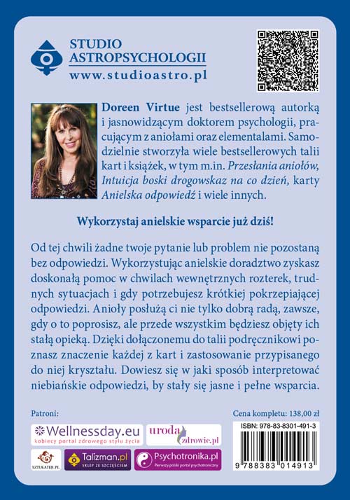 Doreen Virtue stworzyła wyjątkową talię kart – anielskie przesłania wzmocnione magiczną mocą kryształów. Wizerunki aniołów autorstwa Mariusa Michaela–George’a tworzą piękne ilustracje z bogato zdobionymi kamieniami. Dzięki nim uzyskasz anielskie wsparcie w każdym momencie życia – zawsze, kiedy go potrzebujesz! Uzyskasz odpowiedź w nurtujących Cię sprawach sercowych czy zdrowotnych – anioły zawsze służą pomocą i dobrą radą. Ich przewodnictwo zapewni Ci sukces we wszystkich dziedzinach życia, spełnisz swoje marzenia, a ich miłość napełni Cię pozytywną energią.