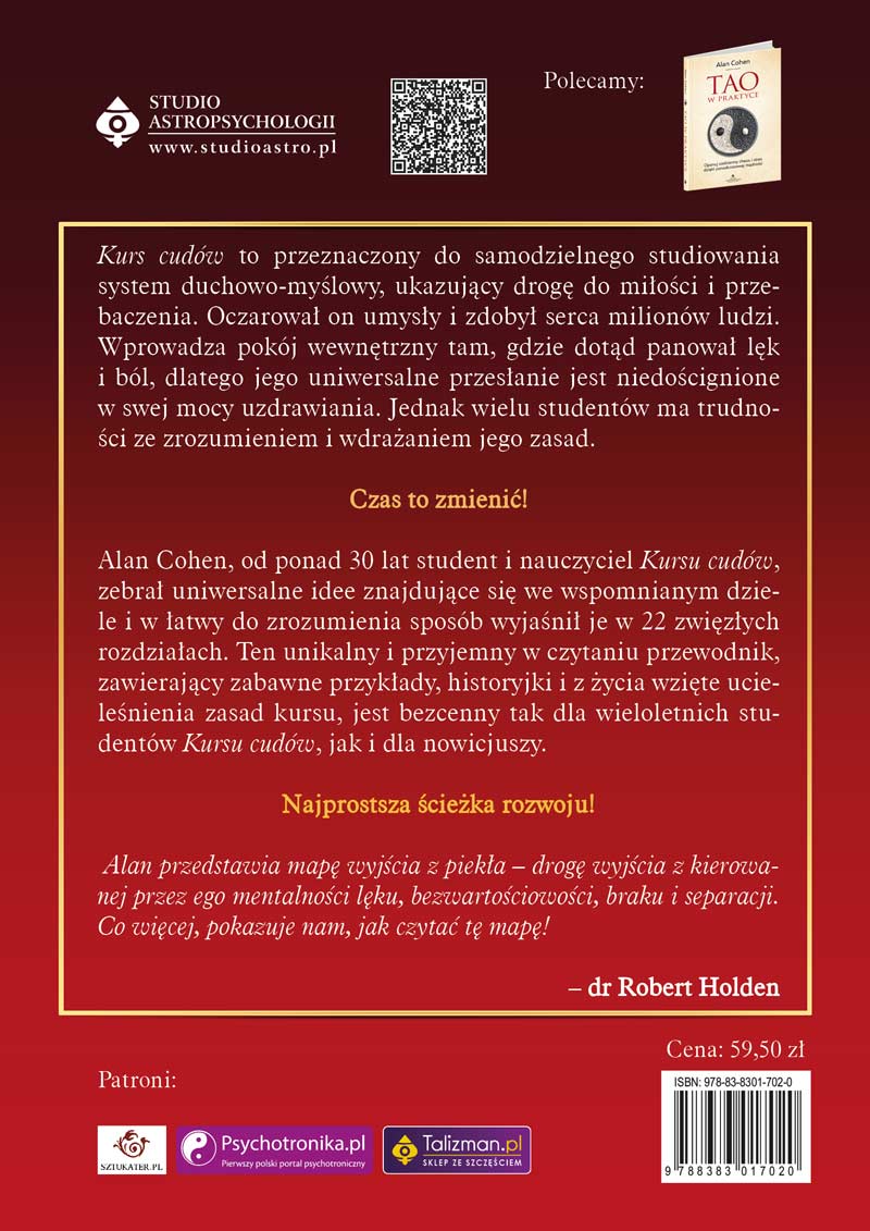 Kurs cudów to jedna z najgłębszych nauk duchowych, jakie kiedykolwiek zostały dane ludzkości. Jego lekcje zmieniły życie milionów ludzi, uwolniły ich dusze spod tyranii lęku i przyniosły pokój umysłu. Doświadczyli oni potężnej mocy terapii uzdrawiania duchowego oraz poszerzenia świadomości i duchowości. Teraz również i ty masz szansę być częścią tych zmian! W tej książce Alan Cohen zebrał najważniejsze nauki i idee Kursu cudów. W prosty sposób objaśnił kluczowe zagadnienia, sprawiając że z pozoru trudny temat zmienia się w łatwy środek do wyćwiczenia umysłu, osiągnięcia szczęścia oraz rozwoju osobistego i duchowego.