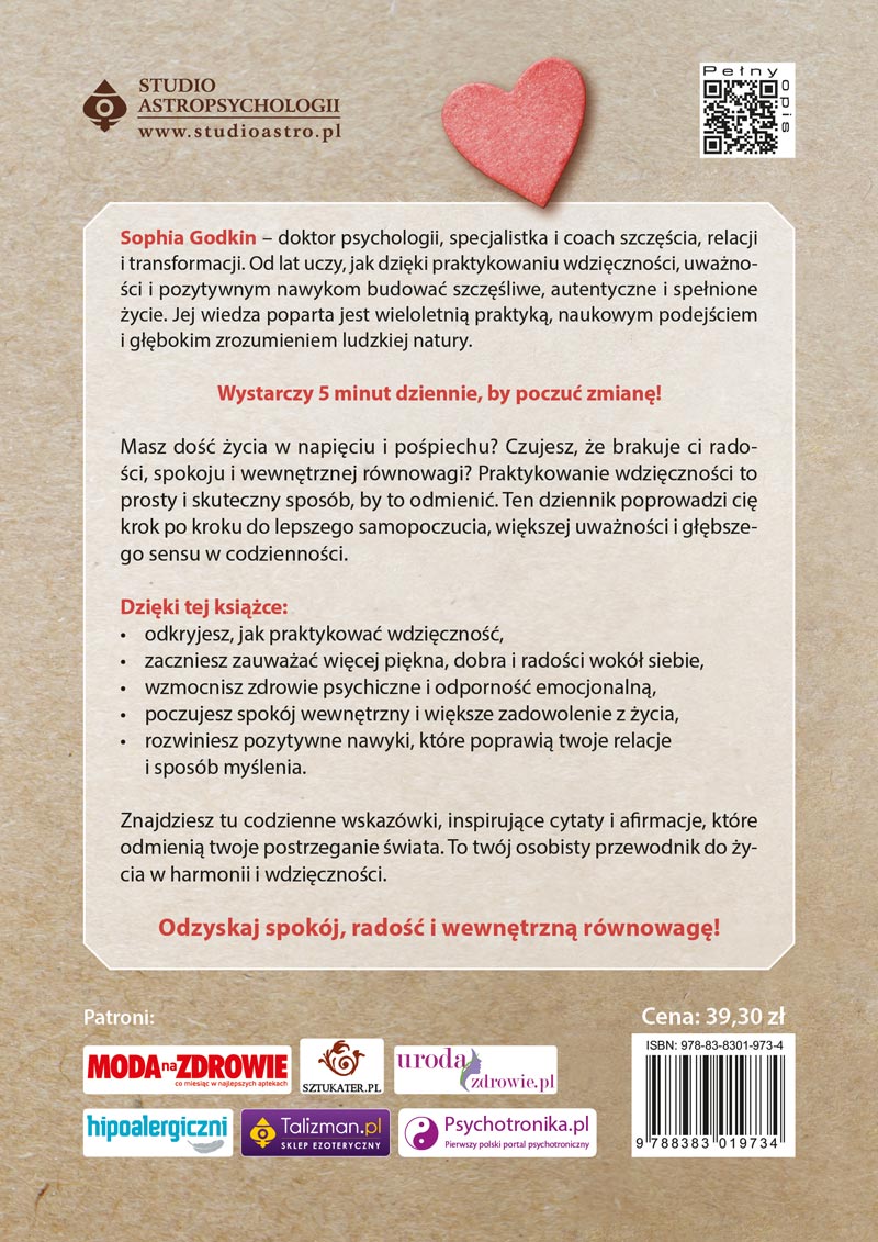 Badania naukowe potwierdzają, że regularna praktyka wdzięczności podnosi poziom szczęścia. Osoby ją praktykujące rzadziej doświadczają stanów depresyjnych, lepiej radzą sobie ze stresem i mają większą odporność psychiczną. Co więcej, ten dziennik to nie tylko zbiór ćwiczeń. To skuteczne narzędzie wspierające zdrowie psychiczne. Regularne wypełnianie jego stron pozwala obniżyć poziom napięcia, poprawia jakość snu i pomaga w budowaniu pozytywnego obrazu siebie. To również świetna okazja do pogłębienia świadomości, zrozumienia swoich emocji i nawiązania głębszego kontaktu z własnym wnętrzem. Każda strona dziennika to krok w stronę twojego rozwoju osobistego. Z dnia na dzień coraz wyraźniej będziesz dostrzegać, jak zmienia się twoje myślenie i nastawienie do życia.