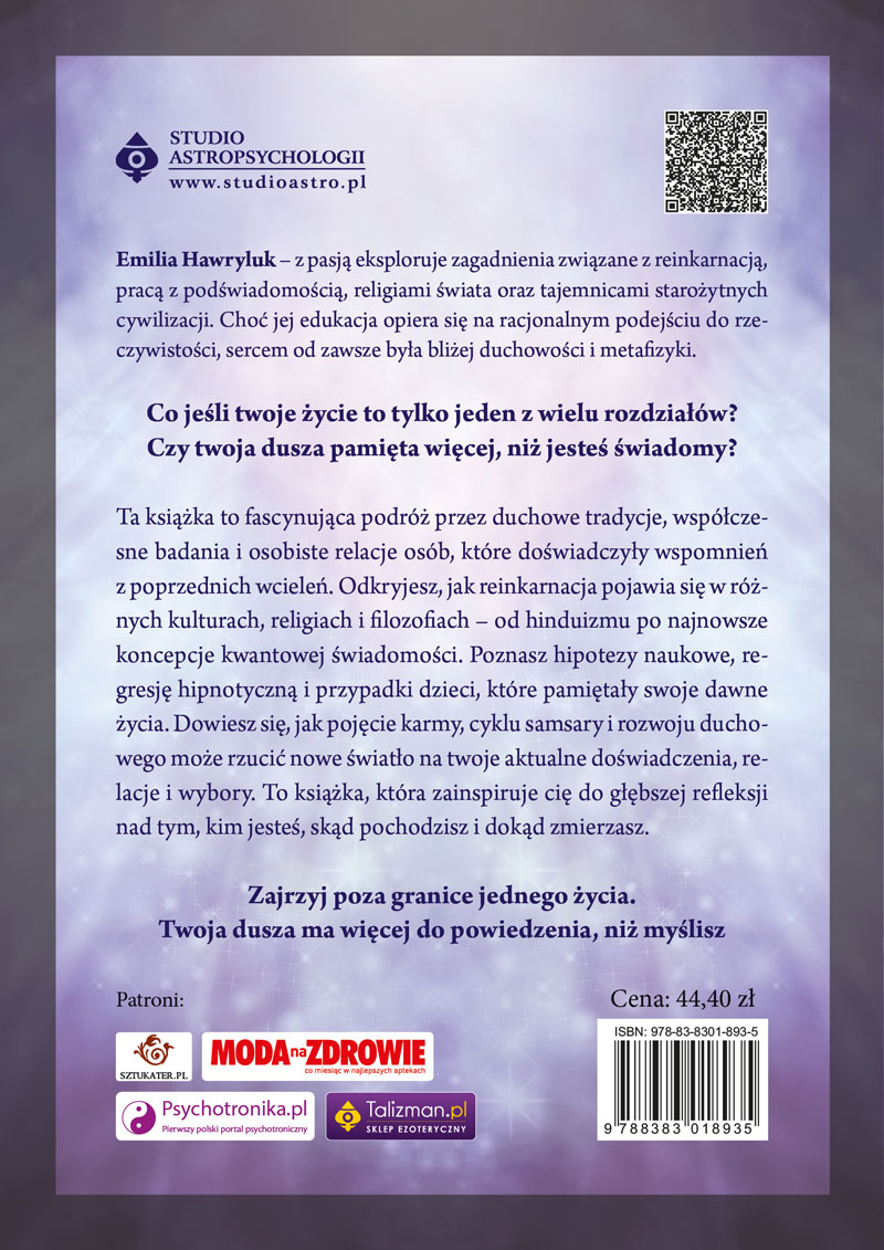 Ta lektura łączy duchowość, ezoterykę, wiedzę i doświadczenie w jedno inspirujące przesłanie. Niezależnie od tego, czy już wierzysz w reinkarnację, czy dopiero szukasz odpowiedzi – ta książka pomoże ci pogłębić świadomość, wzmocnić rozwój osobisty i poczuć sens istnienia. Znajdziesz tu nie tylko opowieści i teorie, ale także dowody na wystąpienie zjawiska reinkarnacji. Mogą one zmienić twój sposób myślenia o sobie i świecie. Wejdź na ścieżkę głębszego poznania i pozwól swojej duszy przemówić.