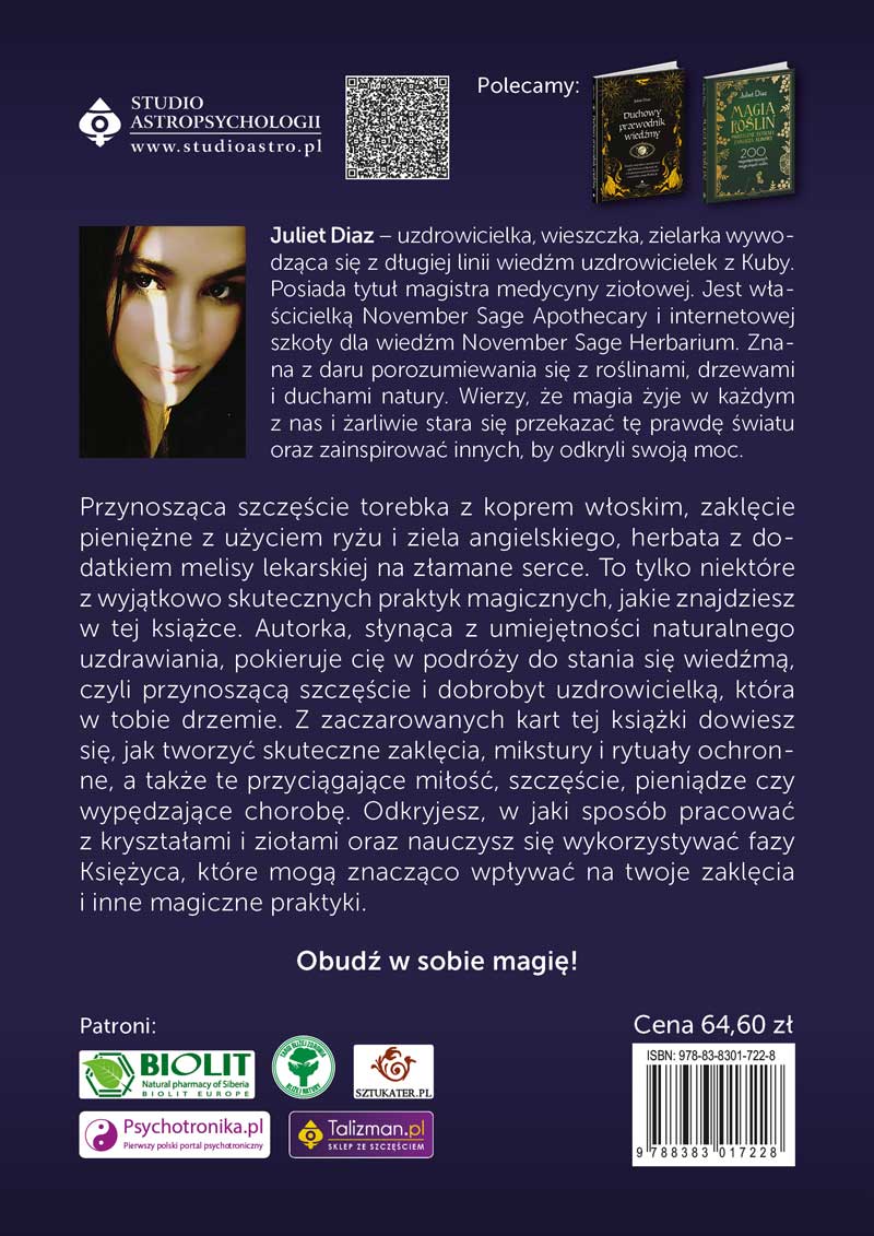 W byciu wiedźmą nie chodzi o wykonywanie magicznych sztuczek, specyficzny styl ubierania się czy bycie właścicielem czarnego kota. Praktykowanie magii daje moc uzdrawiania, zmiany swego życia i spełniania marzeń. W tej książce Autorka, pochodząca z długiej linii kubańskich wiedźm uzdrowicielek, pokieruje Cię w podróży do stania się wiedźmą i pomoże połączyć się z drzemiącą w Tobie magią. Wytłumaczy, jak porzucić to, co niepotrzebne, wyzwolić autentyczne „ja” oraz stać się ucieleśnieniem prawdy. Poznasz również wróżby, symbole, czary oraz prawdziwe zaklęcia magiczne dla początkujących (i nie tylko), które działają!