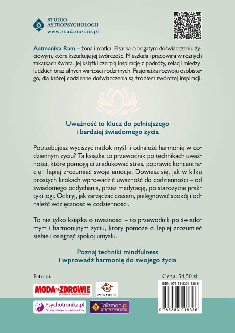 Autorka podkreśla, że uważność to proces, który można rozwijać i udoskonalać poprzez świadomą obserwację własnych emocji, myśli i reakcji ciała. Dzięki prostym metodom samooceny dowiesz się, jak skutecznie wprowadzać pozytywne zmiany w swoim życiu i dostosowywać praktykę mindfulness do własnych potrzeb. To nie tylko książka o uważności – to przewodnik po świadomym i harmonijnym życiu, który pomoże ci lepiej zrozumieć siebie i osiągnąć spokój umysłu.