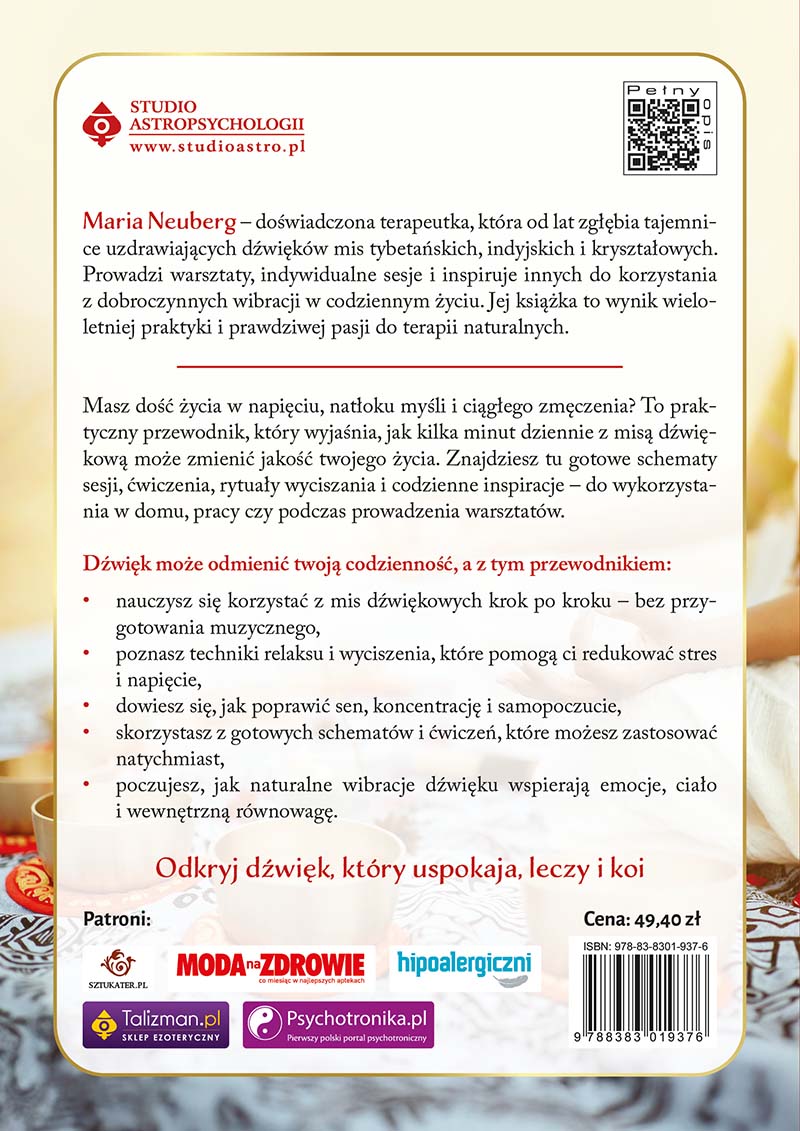 Książka zawiera praktyczne ćwiczenia, wzorcowe schematy sesji oraz checklisty. Co więcej, autorka krok po kroku prowadzi czytelnika przez praktykę z misami dźwiękowymi, oferując jasne instrukcje, codzienne rytuały, a także gotowe struktury do samodzielnego wykorzystania. Dzięki temu z łatwością nauczysz się, jak rozpocząć pracę z misami i w rezultacie jak dobrać odpowiednie instrumenty do własnych potrzeb. W efekcie zauważysz, że możesz w prosty sposób wpłynąć na swoje samopoczucie – wystarczy kilka minut dziennie. Tym samym ta publikacja staje się codzienną dawką spokoju, którą możesz wprowadzić do domu, pracy, szkoły lub też gabinetu terapeutycznego.